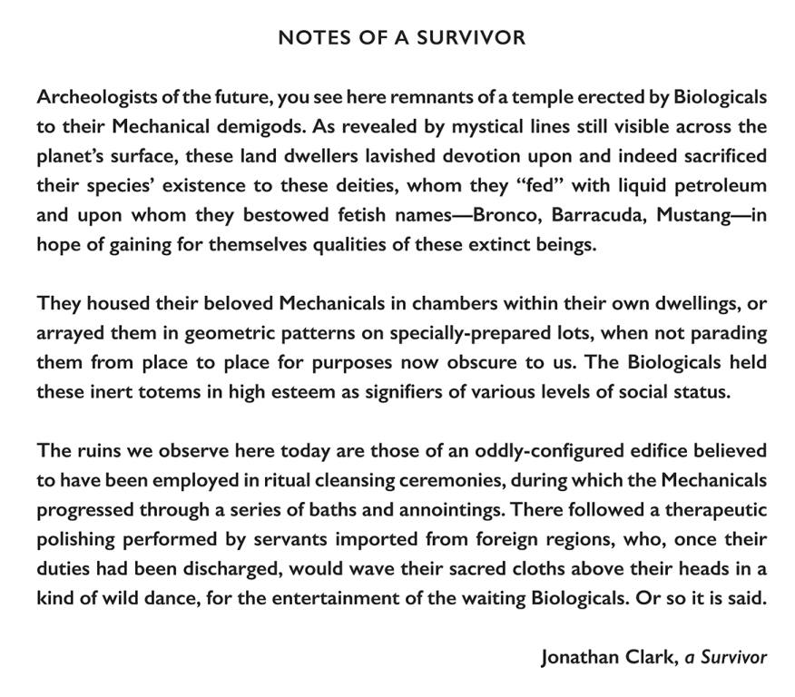 Imaginative narratives by each photographer offer two scenarios for the project. Tress proposes a mystery in the manner of the Hardy Boys; Clark envisions a dystopian archaeological expedition of the future.