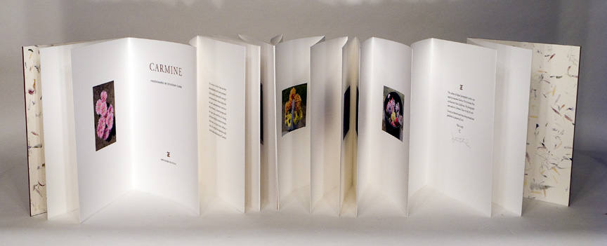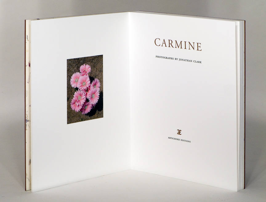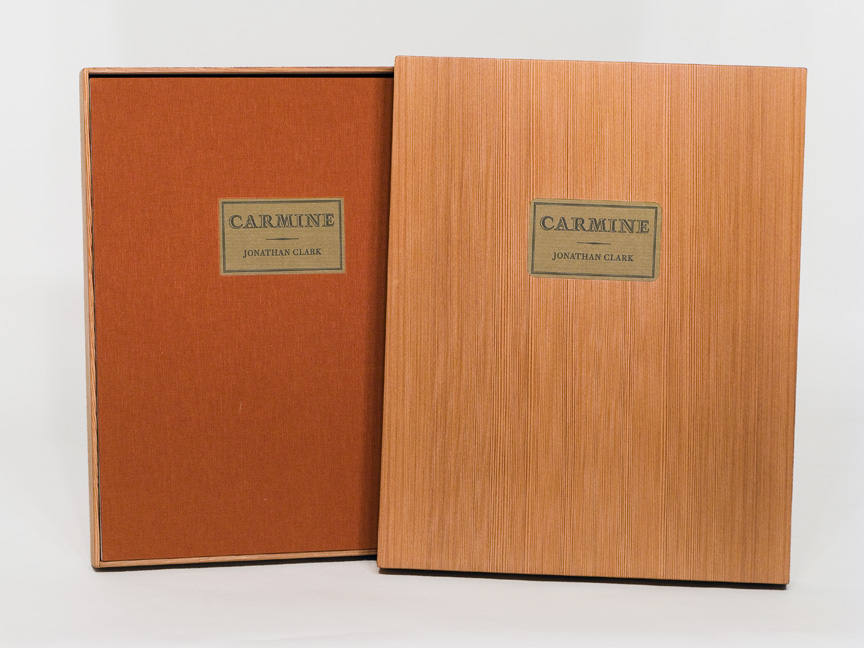 Carmine is a hand-crafted album of 18 original archival inkjet photographs with letterpress text, contained in a custom redwood box. The book was designed, printed, and bound by the photographer. |  |