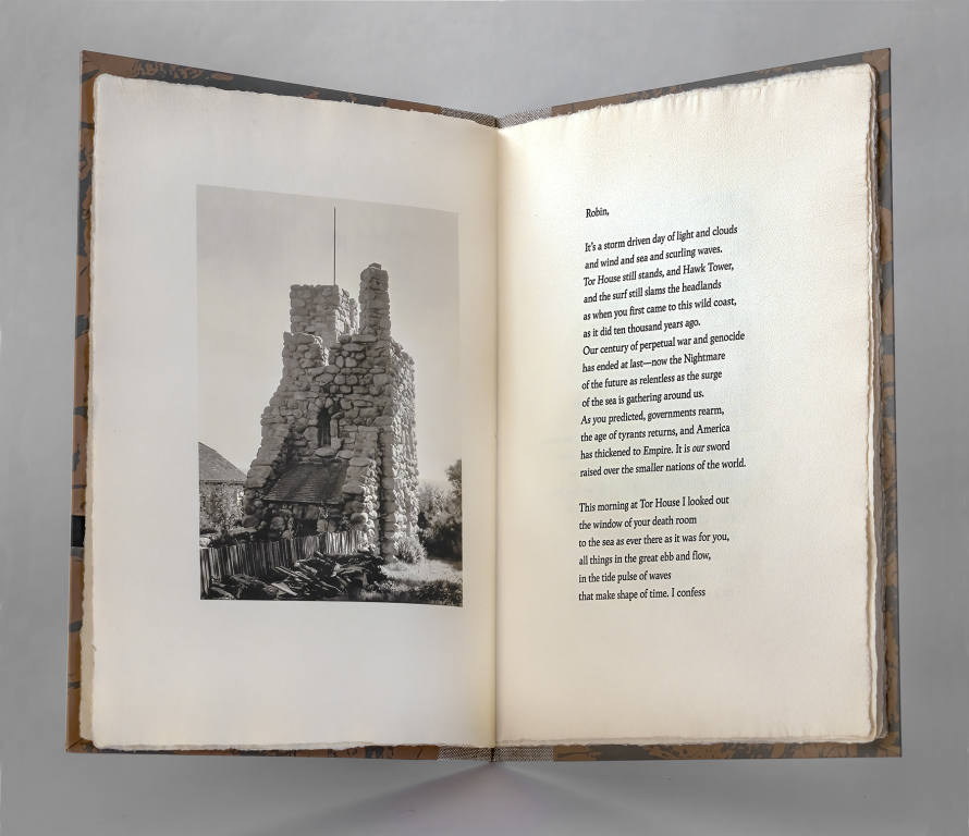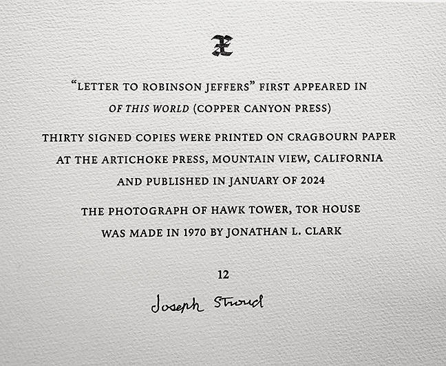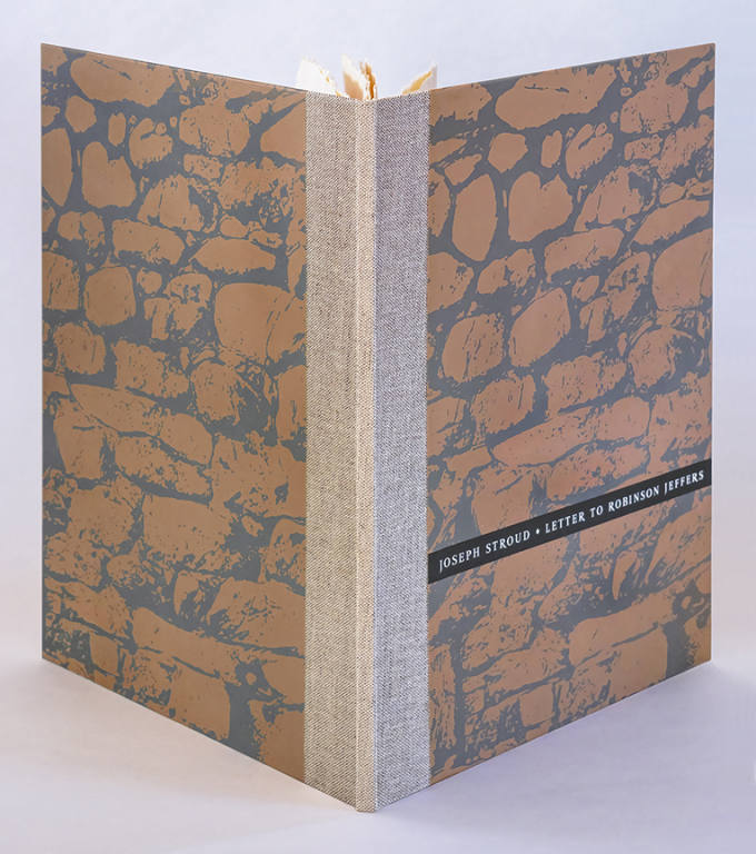 |  | Hand-bound by the printer in decorative paper-covered boards with natural linen spine. The cover paper design is derived from a photographic image of the stones of Robinson Jeffers’s Hawk Tower. Book size 12.75"x10." The edition of thirty press-numbered copies, signed by Joseph Stroud, was published in January, 2024. Inquire for purchase.