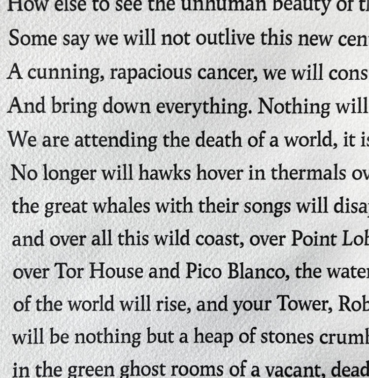 |  | The book is letterpress printed in Wolpe Pegasus types by Jonathan Clark on Cragbourn, a rare vintage cylinder-mould paper made circa 1935 by Hurlbut Paper Mill in South Lee, MA (a paper favored by Bruce Rogers and other fine-press printers of the 1930s). A full-page photograph of Jeffers's Hawk Tower, taken by Clark in 1970, faces the opening page.